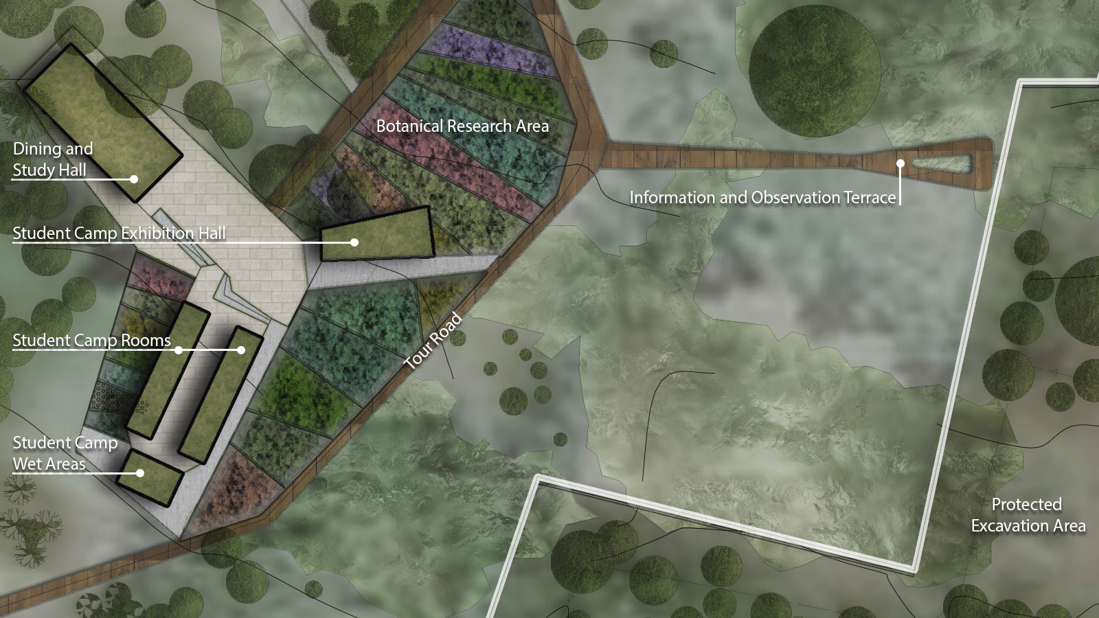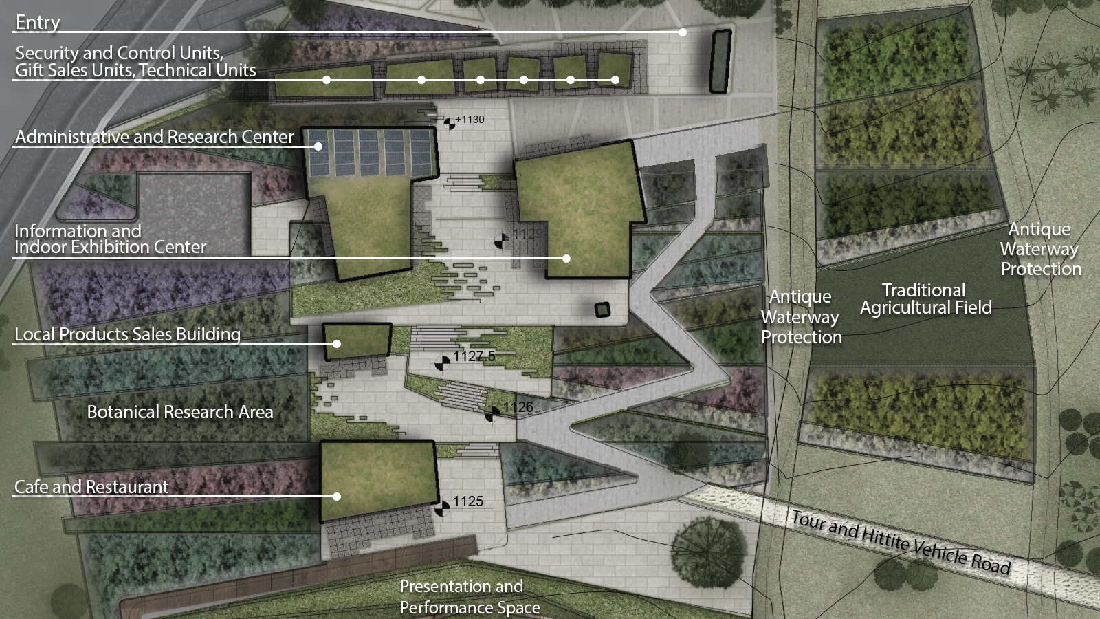 Structures of different scales and functions, including a research center for the Alacahöyük excavations, an information and indoor exhibition center, a camping area for students, a study area and a dining hall, a restaurant where Hittite meals will be served for visitors and a sales unit for local products and souvenirs have been designed.